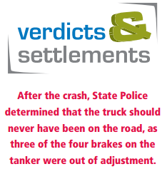 The jury deliberated for several hours before finding Derry completely at fault for the crash. It held his employer, Northeast Carriers, liable for common law recklessness as well as vicariously liable for its driver’s negligence. After the crash, State Police determined that the truck should never have been on the road, as three of the four brakes on the tanker were out of adjustment. In all, the jury awarded $15.7 million to the six plaintiffs.